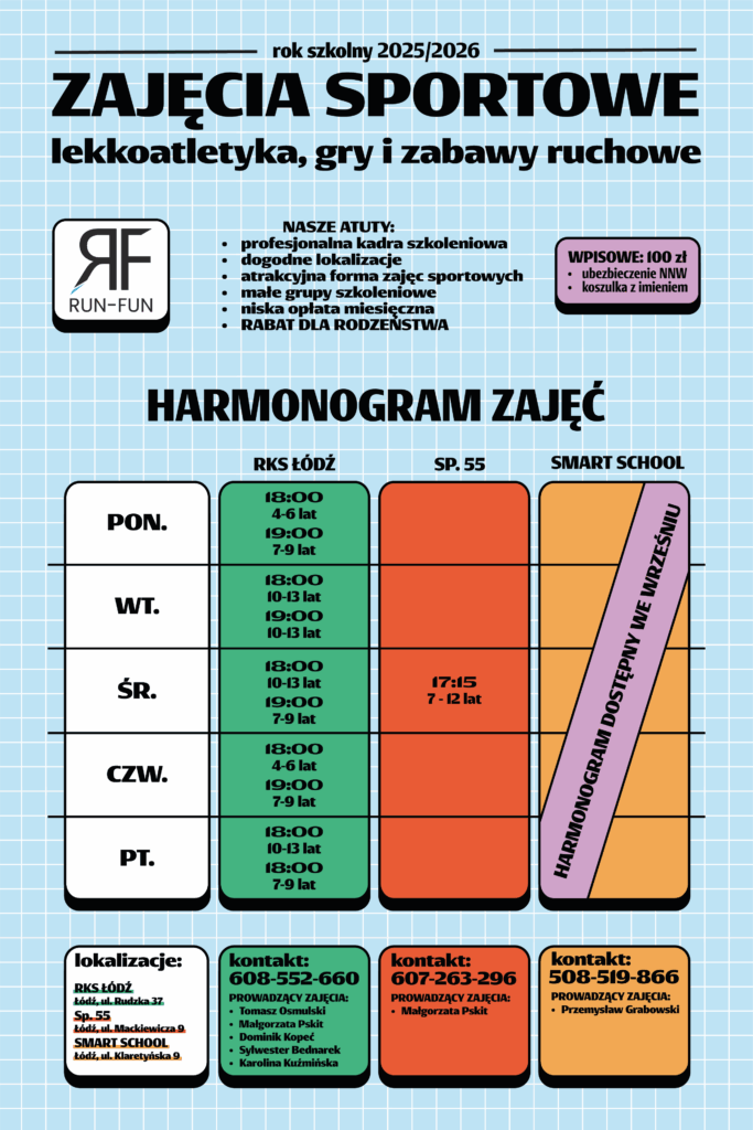 GRAFIK ZAJĘĆ sPRAWDŹ CENNIK Kadra trenerska Zajęcia sportowe dla dzieci - Łódź Obozy sportowe dla dzieci - Łódź Plany treningowe - PMS Grafik zajęć sportowych Galeria zdjęć Cennik zajęć sportowych Zajęcia sportowe dla dzieci w Łodzi